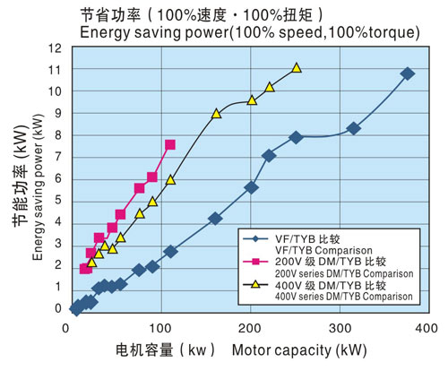下圖是通過(TYB電機++INV)組合下的綜合效率與(感應電機(IM)+INV)、(直流電機(DM)+直流驅動裝置)的綜合效率之差來表示節(jié)省功率的。