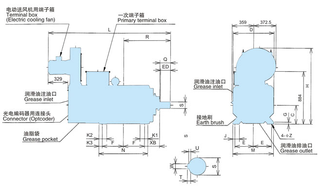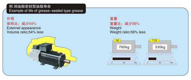 因為轉子幾乎不發(fā)生損失,所以軸承溫度較低,密封油脂壽命大約延長至本公司YVF2系列變頻器專用IM的