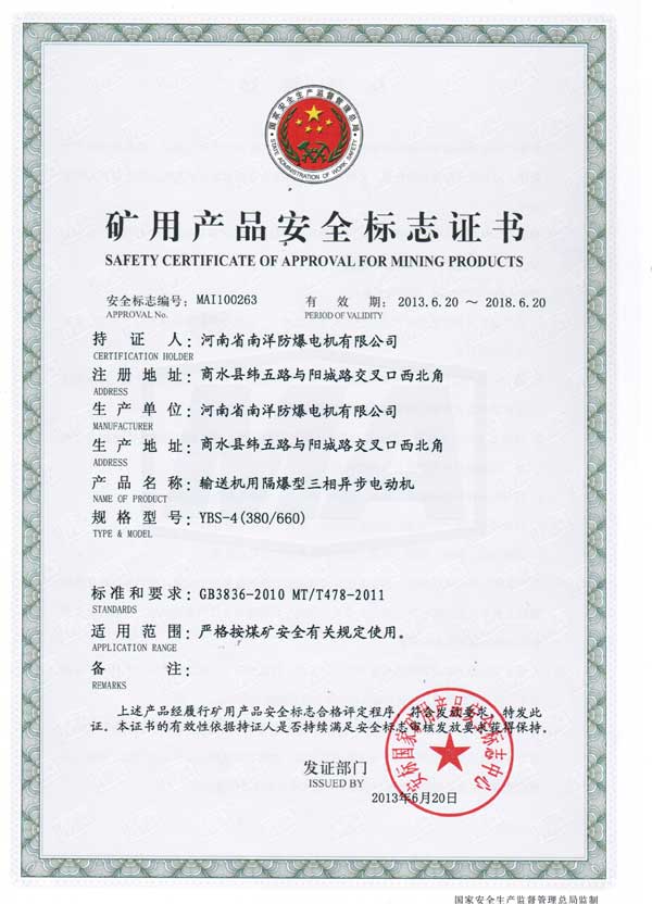 輸送機(jī)防爆電機(jī)主要用于煤礦井下的皮帶輸送機(jī),刮板輸送機(jī)等配套電機(jī),機(jī)座由鋼板焊接成形,風(fēng)罩,接線盒,絕緣結(jié)構(gòu)采取加強(qiáng)措施,防止碎石墜落砸傷電機(jī),已適應(yīng)煤礦井下的復(fù)雜環(huán)境。防爆性能符合GB3836.1《爆炸性環(huán)境用防爆電氣設(shè)備 通用要求》和GB3836.2《爆炸性環(huán)境用防爆電氣設(shè)備隔爆性電氣設(shè)備d》的規(guī)定,適用于煤礦井下具有可燃性氣體或煤塵與空氣形成爆炸性氣體環(huán)境的場所,防爆標(biāo)志為ExdI Mb。